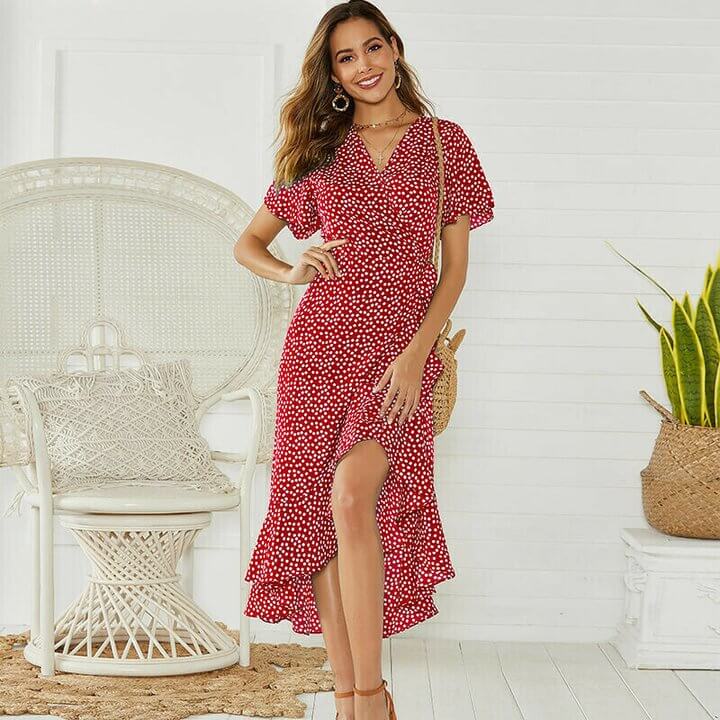 Composite material: Cotton spinning mix+Polyester; Materials: Cotton & Polyester; Style: Casual; Color: as the picture show; Pattern Type: flowers; Neck shape: V-neck; Sleeves: Short sleeves; Length: Below the knee. Our V-neck split sexy Cuihua dress is made of very comfortable fabric and is well made. The fabric is very elastic and comfortable to wear. It has three different colors and is very suitable for leisure,parties,cocktails,picnics,parties,weddings,dances and other occasions. You will find one you like and suit your style!